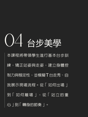 鏡頭練習是自我介紹、拍照姿勢與臨場狀態的掌握,從基本的肢體控制到情緒表達,帶領學員練習如何面對鏡頭不緊張,清楚展現自己個性與特質,創造角色課程則著重在自我探索與內在定位,透過感受、情緒與角色想像的練習,引導學員了解自己在舞台上的狀態與定位,進一步發展個人風格 ,美姿美儀與台步課則從站姿、步伐、體態調整到走秀訓練,協助學員建立身體線條與穩定氣場。